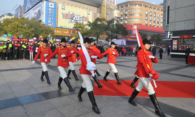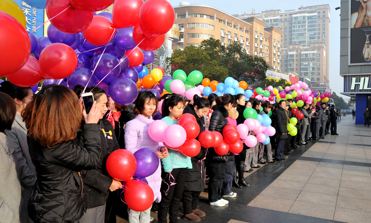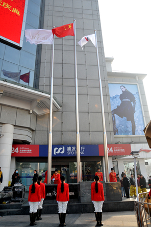 在步行街華億國際南樓門前廣場,400余名員工排列成整齊的隊伍,千余只氣球在空中歡快的舞動著,八門禮炮一字排開,氣氛熱烈。上午九時許,主持人宣布升旗儀式正式開始,華億軍鼓樂隊奏響《國歌》和《華億之歌》,女子升旗手們踢著正步來到旗桿前。伴隨著雄壯的樂曲,五星紅旗和華億集團司旗緩緩升起,迎著新的第一輪朝陽隨風飄揚。