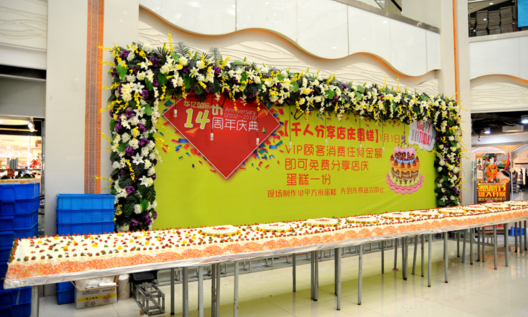 賀辭結束后,彩球飛天,禮炮齊鳴,一塊標有“華億國際十四周歲生日快樂”字樣的大蛋糕被緩緩推進慶典現場。華億國際經營班子主要成員共同切開生日蛋糕,與廣大員工和市民分享店慶喜悅。同時,在華億國際購物中心B座三樓中庭,一塊面積10平方米的巨型店慶蛋糕等待顧客朋友共同分享。自此,華億集團正式拉開了“四五”發展的大幕,開啟了一個全新的時代。