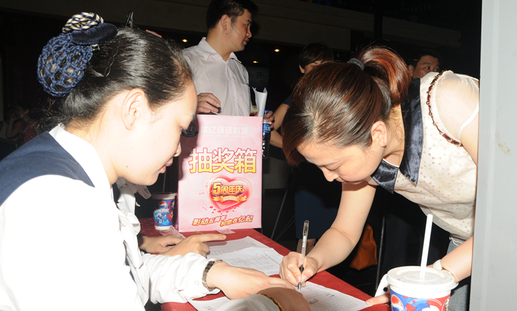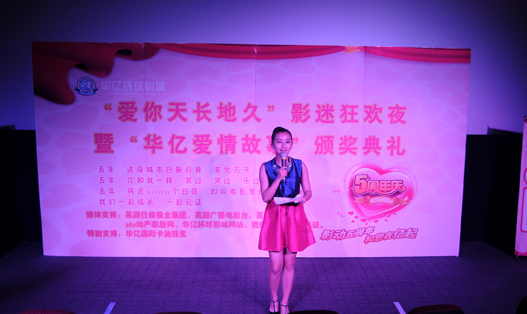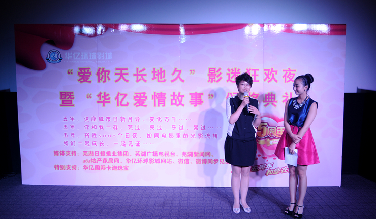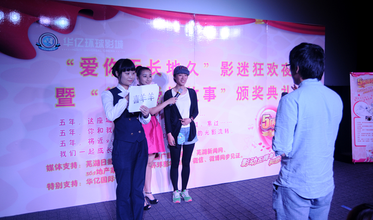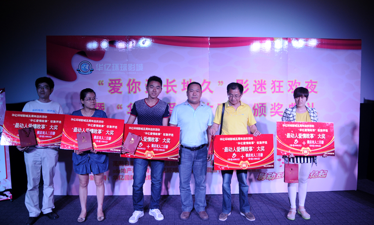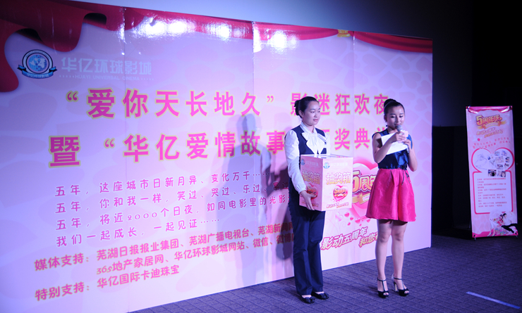 五月初,華億環(huán)球影城結(jié)合五周年店慶,推出“華億愛情故事”有獎(jiǎng)?wù)骷顒?dòng),將評(píng)選出五個(gè)“最動(dòng)人愛情故事”獎(jiǎng),可獲得價(jià)值4580元的鉆戒和橫店影視基地二日游。經(jīng)過近一個(gè)月的征集,共吸引了近百對(duì)情侶報(bào)名參賽。經(jīng)過層層評(píng)選,數(shù)十對(duì)情侶影迷的愛情故事入圍,通過媒體展示,投票推選,最終,五對(duì)影迷情侶獲得鉆石旅游大獎(jiǎng),十余組情侶獲得華億環(huán)球影城鉆石影迷卡。