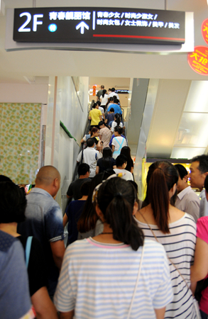 晚上7時,華億國際A、B座同時打開大門,排隊的人群如泄洪的江水一樣,涌進華億國際購物中心,原本寬敞的過道瞬間變得擁擠起來,仿佛一場萬人馬拉松賽起跑時的場景。進入商場的市民迅速奔向目標專柜,火速搶購超值商品。從開門到排隊客流全部進入商場持續了近十分鐘。