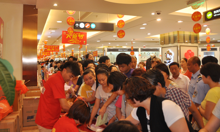 開門后五分鐘,各大專柜內人潮涌動,銷售人員拉高音調盡力向顧客解說清楚貨品的促銷力度、價格、尺碼等信息。收銀臺前排起了付款的長龍,工作人員快速收款、點鈔、蓋章,熟練且專注。在禮品發放區由于消費者眾多,安保人員不得不站在桌子上,拿著擴音器維持現場秩序。商場通道內顧客摩肩接踵,消費者拎著沉甸甸購物袋行走起來略顯艱難,但臉上露出開心的笑容。